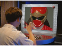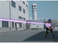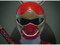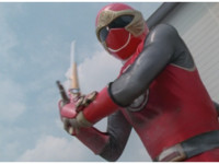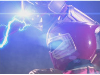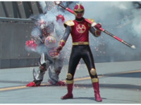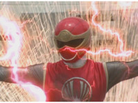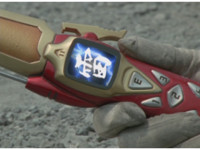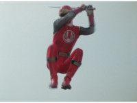Red's Ninja Sword display kanji twirls and flashes. Red looks at it, then looks up as Bopp-a-roo, who crackles with power and is ready to fight, Red getting up, talking and readying Sword. Bopp-a-roo fires electricity from his gloves at Red, who blocks the energy and deflects it to sparkily bursts behind him. The monster reacts, as Red charges up his Sword with electricity. Bopp-a-roo charges at him, Red slashes with power several times before flipping about face and posing as the monster bursts and finally falls over. |