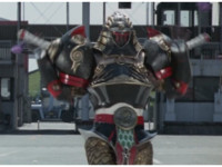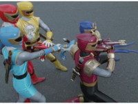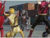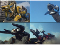 Four-screen shot of Lionzord, Dolphinzord, Crimson Insectizord, and Navy Beetlezord roll into battle. |