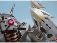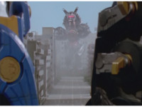 Bopp-a-roo smacks gloves together, then rushes forth, Storm & Thunder Megazords ready Serpent Swords and press onward, the monster charges, they both slash swords at him, but he blocks with his gloves and sparkily punches them back, they stagger back. Bopp-a-roo charges up his fist with fiery power, then punches a flaming spurt that spark bursts the Megazords. |