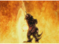 Red talks at Crimson, then turns around as Bopp-a-roo, who talks, then fires reddish electricity from his gloves at the pair, knocking Red down, but Crimson shields himself with his staff and presses onward, making his way slowly forth at the monster, who soon ceases trying to fry him to quiver. |