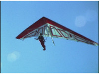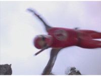 Red presses his belt buckle, and as he flies straight upward, his Ninja Glider materializes onto his body. |