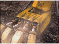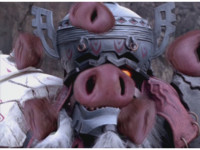 General Trayf readies sword, then slashes it downward, causing a giant double of the blade to rip through the ground, sparkily slashing past the Rangers, knocking them down. Trayf gestures and causes dozens of snouts to float around the scene, spark bursting the Rangers down again. |