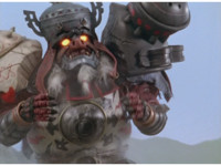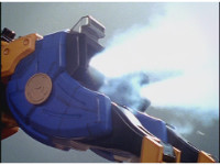 Zoom out from Red as he talks to his excited teammates. Yellow nod-talks with his disc, then turns and reaches over. Yellow inserts the Disc into the slot, and pulls the lever. Power Sphere 02 pops out of Storm Megazord's chest, and hatches into the Ram Hammer. |