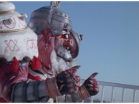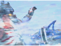 Dolphinzord floats forth in front of a huge tidal wave. |