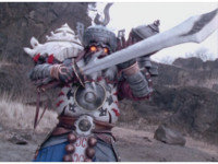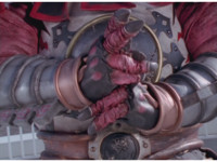 General Trayf spreads arms and talks, Red readies sword, he and the others leap up, he goes to strike Trayf, but he grabs the blade and flips Red over. |