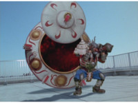 General Trayf talks, then motions arms, sending his giant pot lid flying forth at the Rangers, Red readies sword, then leaps off his teammates's locked arms, lands on the flying lid and rides it through the air, right back into General Trayf, leaping off as it slams into him and explodes massively. |