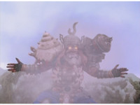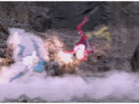 Yellow gestures hand and talks, Lionzord anchors foot to the ground. Lionzord sprays a tunnel of wind and rocks forth. Lionzord farts steam, sending it flying forth, flying through the tunnel of wind and rocks over the mountains. |