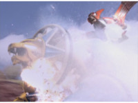 Cuts follow-ups of him talking more to Megazord, then tossing lids explosively at it, which it avoids, then the Rangers using the blizzard shoulder attack, then summoning Serpent Sword. |