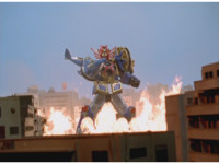 ![]() ![]() Green Samurai's golden vest falls to the ground, putting a dent in the cement. He switches to Super Samurai Mode by spinning his upper helmet portion around, flames igniting around him. | |