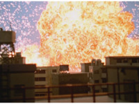 Cuts shot of Megazord lowering weapon between shots 6 & 7; cuts follow-up of Megazord through flames. |