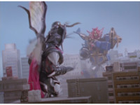 ![]() ![]() ![]() Starvark clutches hands together, then a swirl of flames spins out of his eye, igniting the city around Storm Megazord. |