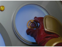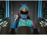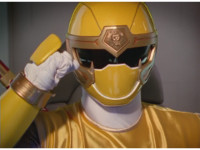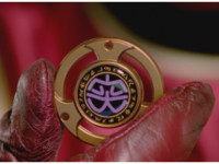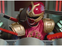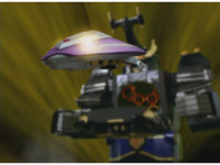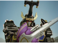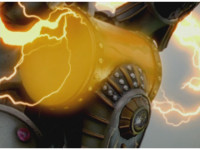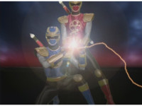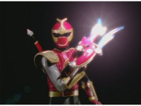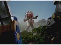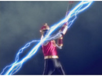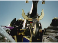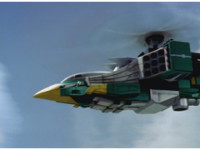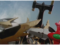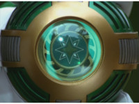 Green Samurai nod-talks with a Power Disc in hand, puts it in the dash, causing it to portal over to Crimson's cockpit, where he picks it up, looks at it, talks, then puts it into the slot and turns the lever. Power Sphere 11 pops out of Thunder Megazord, hatching into Sting Blaster, which attaches to Thunder Megazord's right hand. |