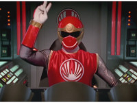 DJ Drummond towers gigantically over us, the six Rangers react, Red talks into his Morpher, and Crimson summons into his Morpher. |