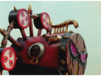 Cuts follow-ups of Green Samurai pointing, talking, and a close-up of Drummond's head topper. |