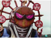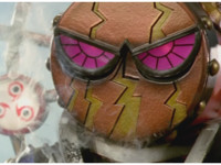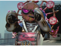 DJ Drummond staggers back, smoking, as the Thunders stand facing him, Navy, then Crimson, talking at him. DJ Drummond jerks arms about while talking, beats his chest drum, then fires yellow electricity at the two Rangers, spark bursting them both down. The monster laughs, then turns around to see the Winds rushing at him, swords ready, Red leaping up and striking at the same time as his teammates, but he shrugs them off and fries them with his electricity, spark burstingly. |