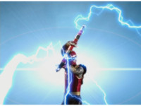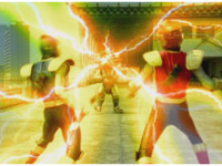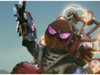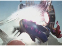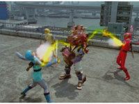 Green Samurai talks with an arm jerk, Navy responds then slides over his HUD, as does Crimson, Thunder Megazord readying Sting Blaster as DJ Drummond runs toward it. Thunder Megazord ninja streaks past the monster repeatedly, sparkily slashing on the way by. Thunder Megazord then prepares Sting Blaster, before jabbing it forth, firing energy from it. |