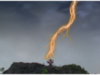 As yellow lightning strikes him, DJ Drummond plays his bodily drums and charges up with electricity, his chest drum glowing. |