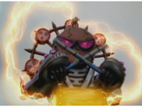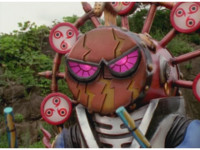DJ Drummond releases the blade sharply, Green Samurai staggers back, and the monster unloads yellow electricity from his chest drum into him, sending him chest bursting as he's flung back. |