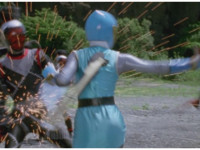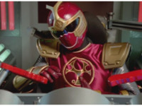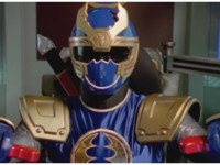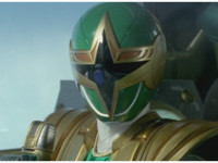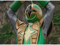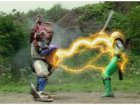 Green Samurai leaps up, pulls out his Saber, and sparkily slashes DJ Drummond repeatedly, until he raises the Saber and strikes downward, allowing DJ Drummond to grab the blade and hold it down as the Ranger reacts. |