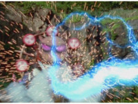 The Thunders leap over the camera, Navy dives in with his Antler, snagging DJ Drummond sparkily, before flinging him into the air with it. DJ Drummond lands safely, though is dazed, when Crimson rushes over and sparkily strikes him with his Staff. Crimson twirls his Staff around as blue electricity crackles about, finally slashing the monster twice with energy trails, causing him to writhe. |