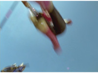 Cuts before he talks more and puts drumstick to forehead; pushed way back from source position. |
