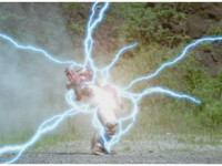 DJ Drummond is struck by blue electricity, spark bursts, and is flung into the air, landing harshly. |