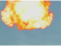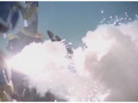 DJ Drummond's eyes flicker on and off as he talks, before being lifted off his feet, then Thunder Megazord flings the Sting Blaster beam upward, releasing DJ Drummond, where he explodes massively up in the sky. Thunder Megazord lowers Sting Blaster triumphantly. |
