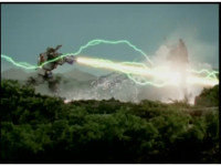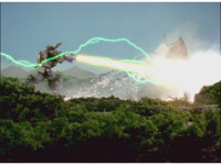 Thunder Megazord impales DJ Drummond with a beam from its Sting Blaster. |