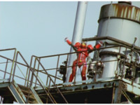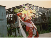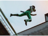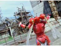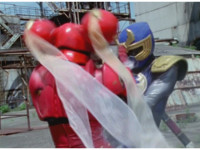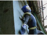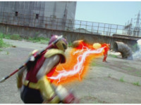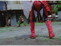 Beevil gestures her hand about while talking, then spreads her palm and fires a blast, which spark bursts Green Samurai, knocking him off the catwalk. He falls to the ground, rolls over, and talks as the Winds race in behind him. Beevil points and taunts while talking across the alley at the four Rangers. |
