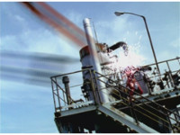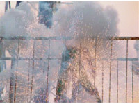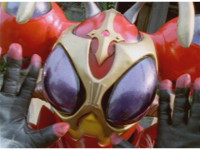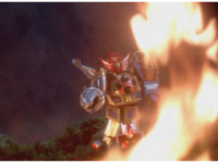 Storm Megazord lands, poses battle ready, Beevil, crackling, collapses and explodes massively. Zoom in on the Megazord through the flames. |