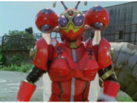 Storm Megazord swoops down and impales Beevil with its Star Blazer knee, a superimposed explosion erupting over the impact, sending her rolling. |