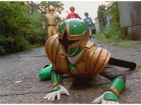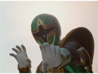 Beevil is about to strike with her spear, when a yellow energy ball sparkily strikes her, knocking the spear out of her hand. Beevil looks over and sees Green Samurai nearby, speaking over at her and posing. |