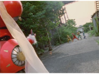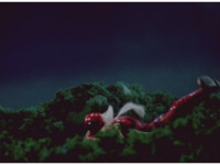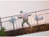 Close-up of Beevil, waving at us, then turning around, and leaping up into the sky. |