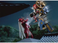 Storm Megazord leaps up into the sky, Star Blazer attaches to its left knee, and Beevil reacts from the ground. |