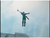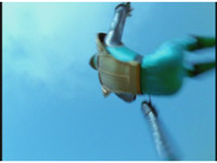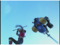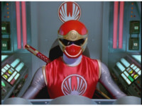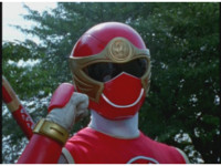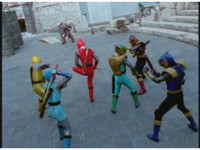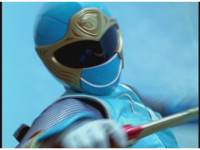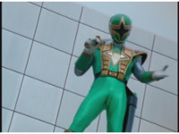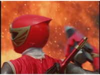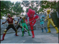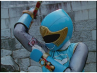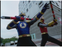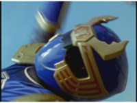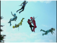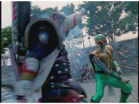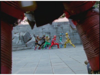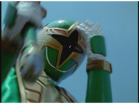 The patches vanish from Blue and Green Samurai in a flash, causing the Rangers to drop down from the sky. |