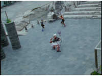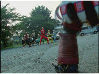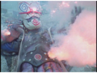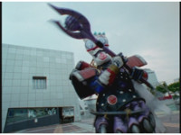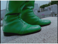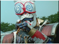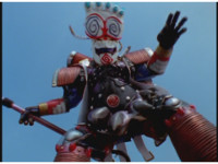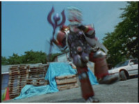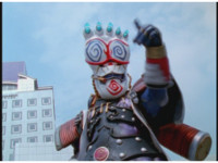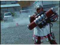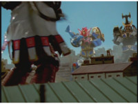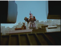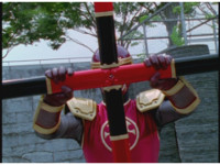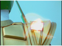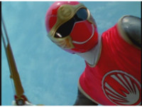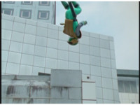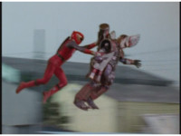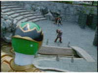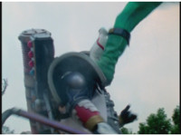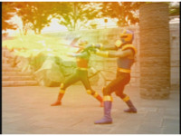 Green Samurai flips over, bounds off Footzilla, and lands atop a roof edge. Footzilla talks at him, he replies with a casual gesture, then leaps off, and sparkily slashes the monster a few times. |