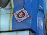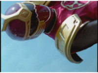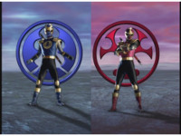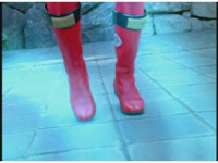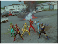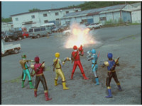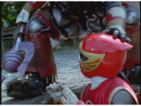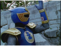 All six Rangers regroup together to face Footzilla, who responds briefly. The Rangers begin to inspect their bodies, finding patches on various parts of their costumes. Navy finding his on his arm, Blue finding her's and trying to pull it off. The Rangers struggle with them as Footzilla laughs. |