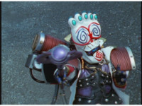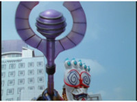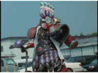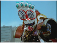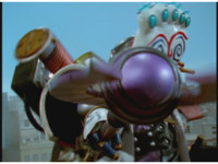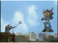 Footzilla tosses a patch forth, attaching to Thunderstorm Megazord's leg. Footzilla then holds his staff forth. |