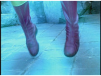 Footzilla races about, clutching his butt, in a comedically sped-up shot, until he runs into a wall and passes out. |