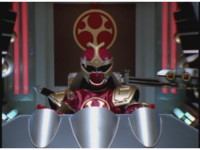 Power Discs already inserted, Red & Crimson turn the levers, causing Power Spheres 7 & 8 to pop out of each Megazord's chest, hatching in an energy tunnel into parts that connect into Minizord, who floats up in the air. |