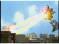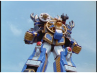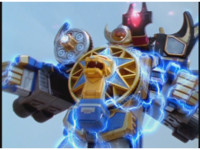 Thunderstorm Megazord pulls the cord through its Lion chest, firing energy from its chest, back-cannon, and shoulder gatling. |