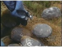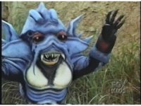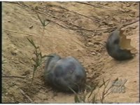 Squatt breaks egg in half on rock, then raises it up over head, tilts head back and chugs down the green slime filling in the delicious Hostess' Gooney Bird Egg. He raises his head back up when finished. |