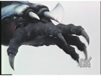 Close on Dragonzord, throwing out arms, then turning right and whipping up tail at camera. |