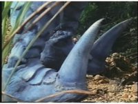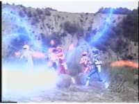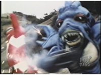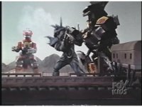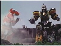Tyrannosaurus swings tail, Fang hops over it, Dragonzord Battle Mode slashes Tail Staff at him, he grabs and shoves it away, before turning and sparkily slashing Tyrannosaurus. DZBM tries the Tail Staff again, Fang fends it off after much struggle, but is left open for a sparkily slash by Tyrannosaurus. |