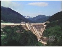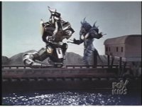 Camera tracks right over the 2000 Flushes Lake behind the dam, as Fang makes his way over to the center, only to find Dragonzord waiting for him. |