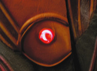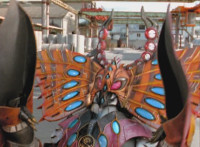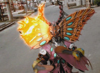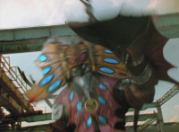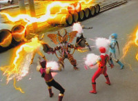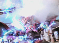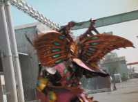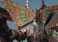 A light on Goldwinger's back begins to blink and gleam, before he regrows his ear. Crimson reacts, Navy talks, then Red readies his sword, as all five Rangers strike Goldwinger at once. Sparks fly briefly, but the monster shrugs them off and crackles them spark-burstingly with golden electricity. |