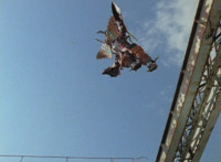 Goldwinger leaps upward toward a girder or scaffolding. |