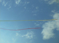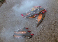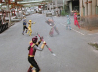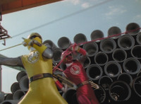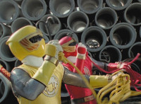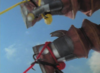 Yellow & Red toss Ninja Grappling Hooks into the air, snagging each an ankle of Goldwinger, then yanking the ropes, dragging him down. |