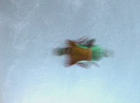 Goldwinger looks downward while flying, then dives down from above and lands on both feet. |