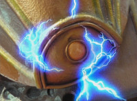 Crimson twirls his Staff around as blue electricity crackles about, finally slashing twice with energy trails. |